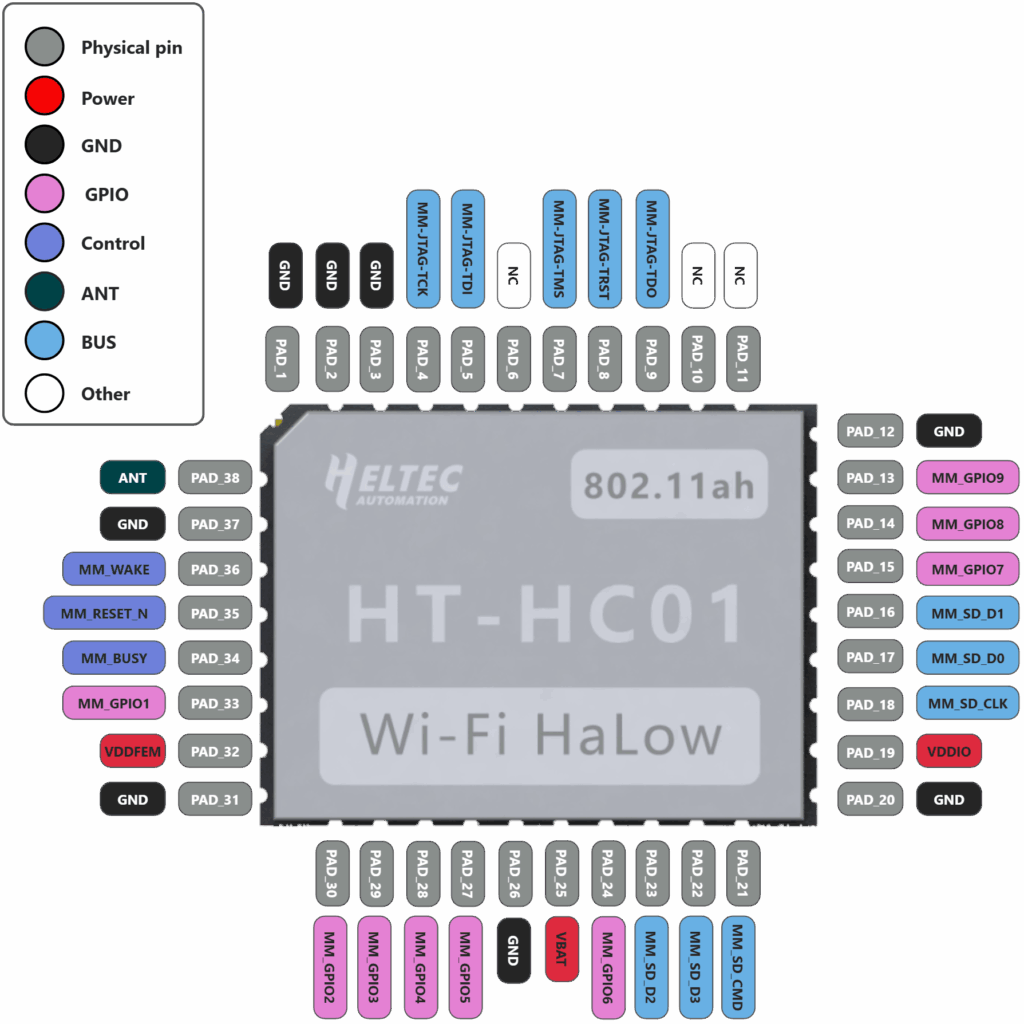 HT-HC01 is a Wi-Fi HaLow module with excellent RF performance, which operates in 902 – 928MHz, with maximum data rates of 32.5Mbps and up to 1-2km transmission range. It uses LLC package, small size and rich pin, can be very convenient to integrate in a variety of PCB. It includes ultra-long range PA, high linear LNA, T/R switching, 32 MHz crystal oscillator, and is designed to simplify Wi-Fi HaLow connectivity to external hosts for applications. It meets IEEE 802.11ah standard, which is specifically designed for battery-operated devices, allowing them to remain in longer sleep and idle states without frequent wake-ups. This significantly reduces power consumption and extends the device’s battery life.
